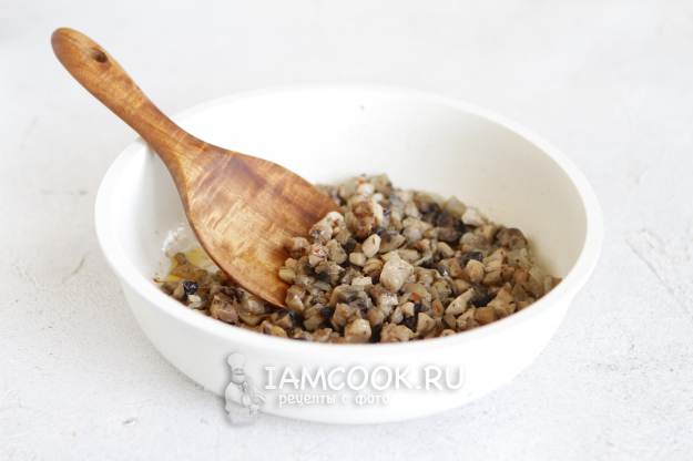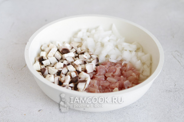 Подготовленный лук, грибы и курицу слегка припустить на оливковом масле (или любом другом масле) в течение 5 минут.