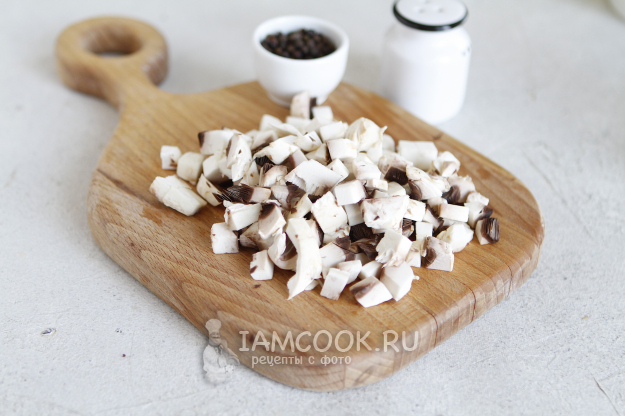 Грибы, в моем случае это свежие шампиньоны, промыть, обсушить бумажным полотенцем и нарезать так же, как и курицу.