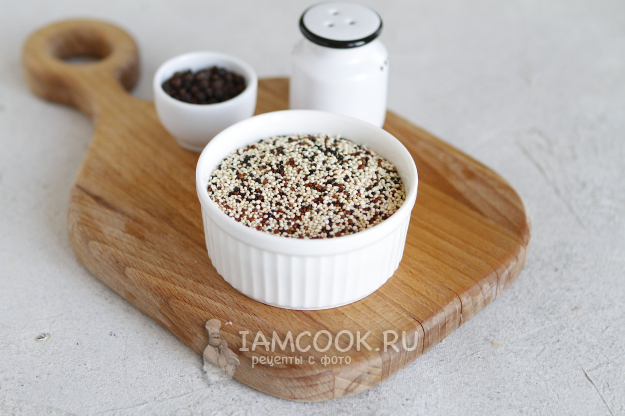 Киноа хорошо промыть под проточной водой, откинуть на дуршлаг. Переложить в сотейник или небольшую кастрюлю, добавить воду (1:3) и отварить согласно инструкции на упаковке в слегка подсоленной воде.