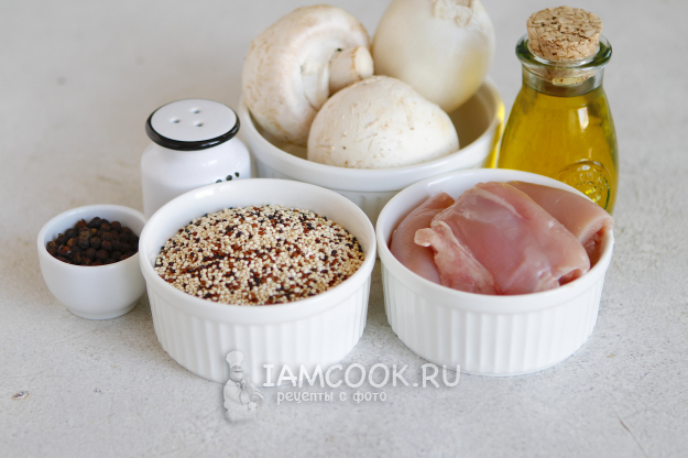 Продукты для приготовления киноа с курицей и грибами - перед вами.