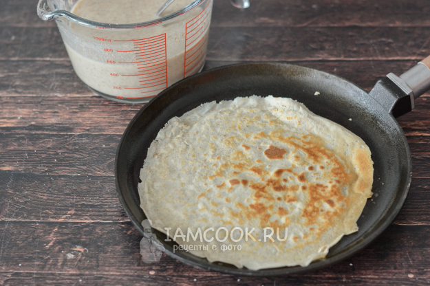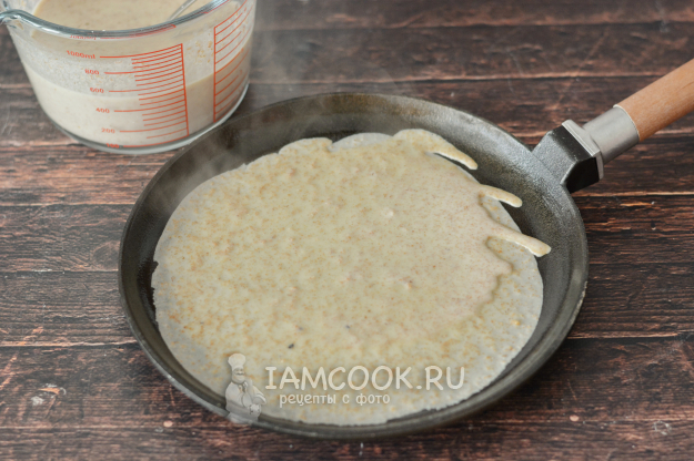 На разогретую сковороду, смазанную маслом, налейте немного теста (примерно половину половника) и распределите его по всей сковороде, вращая её.