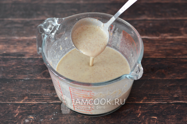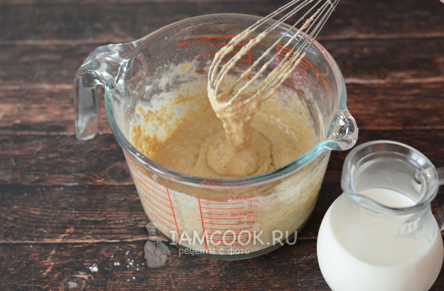 Ориентируйтесь на получающуюся густоту теста, оно должно быть по консистенции как жидкий кефир.