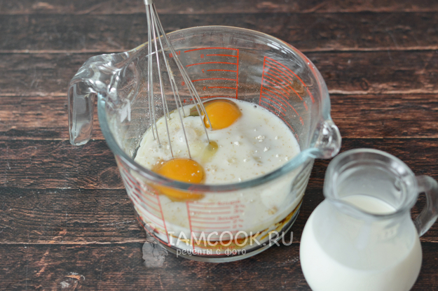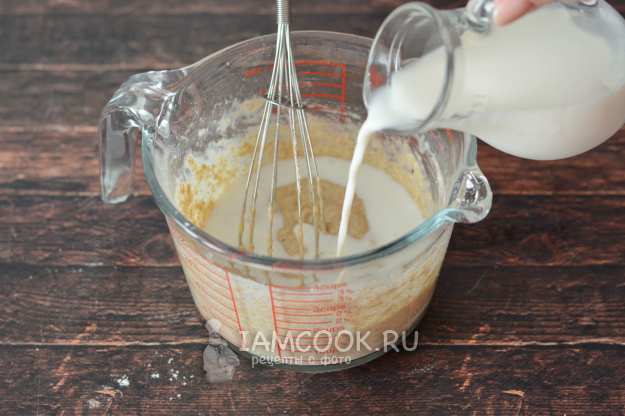 Влейте сюда же примерно четверть всего молока и тщательно размешайте тесто венчиком.