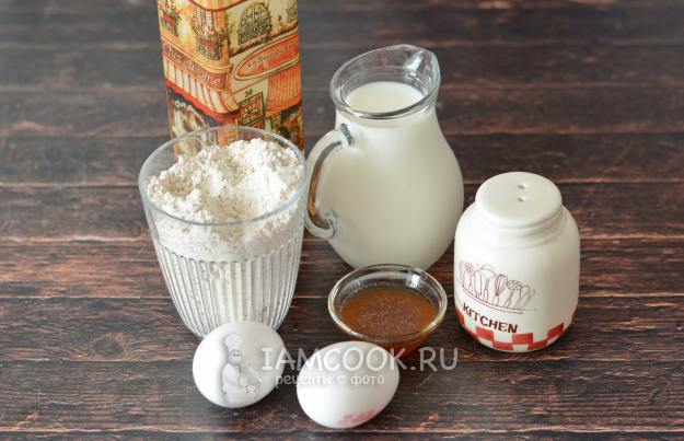 Для приготовления ПП блинов из цельнозерновой муки на молоке соберите необходимые продукты по списку.