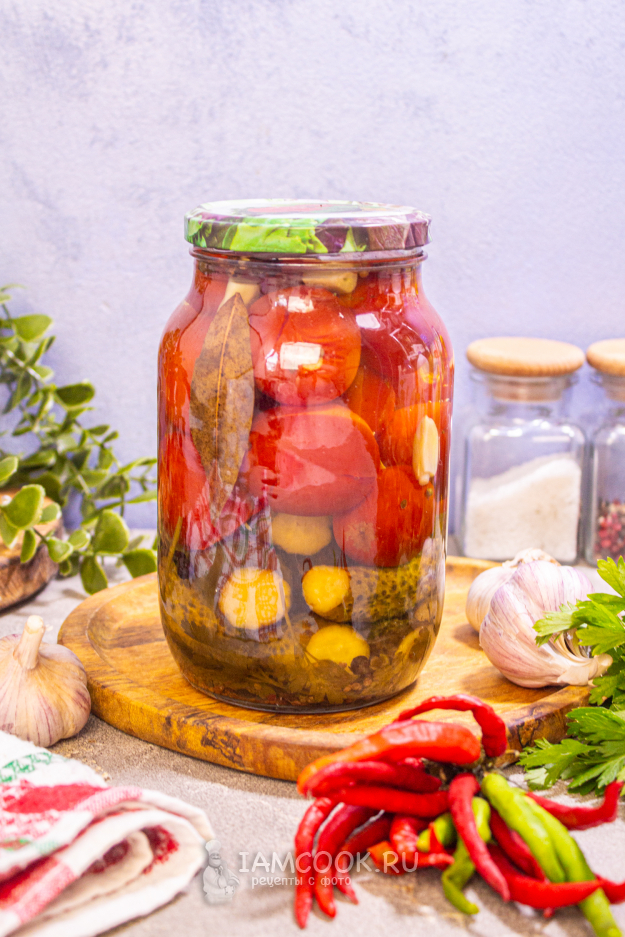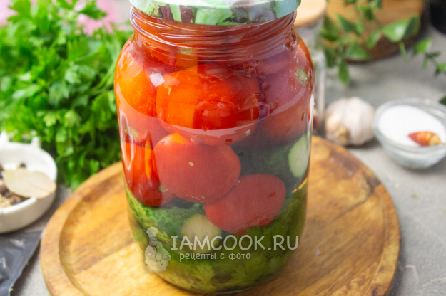 Маринованные огурцы и помидоры без уксуса на зиму готовы! Перенесите баночки в прохладное место для хранения.