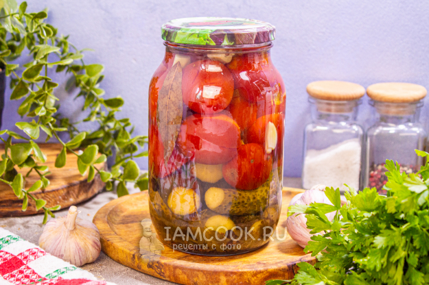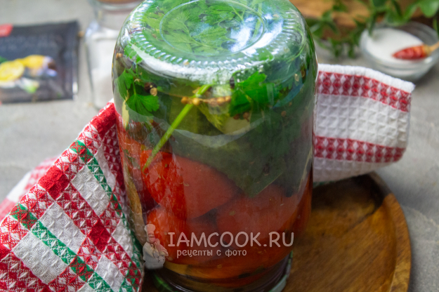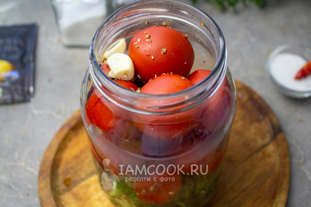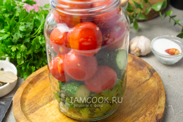 На дно подготовленной банки уложите зубчики чеснока и свежую ароматную зелень петрушки. Затем наполните банку огурцами и помидорами.