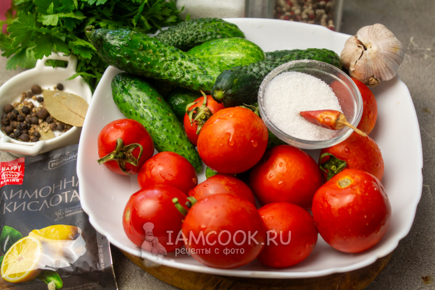 Соберите все необходимые продукты для маринования огурцов с помидорами на зиму без уксуса. В рецепте я покажу пример на 1 литровую банку. Консервирую всегда без стерилизации, методом двукратной заливки — один раз пропарю овощи чистым кипятком, а затем залью маринадом со специями и лимонной кислотой. Если будете готовить в 3-литровой банке, то рекомендую выполнить трехкратную заливку.