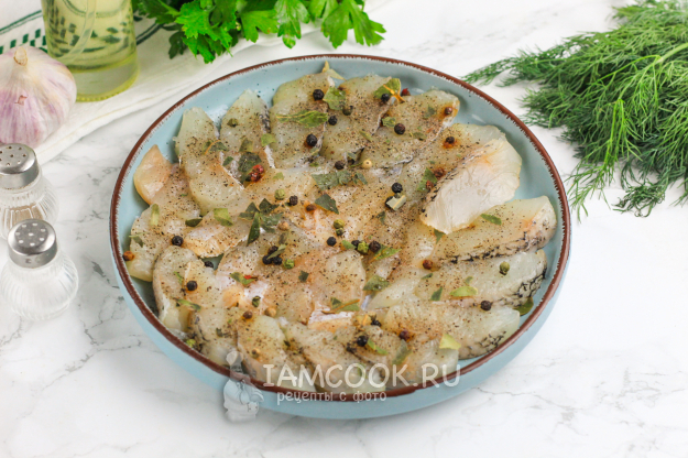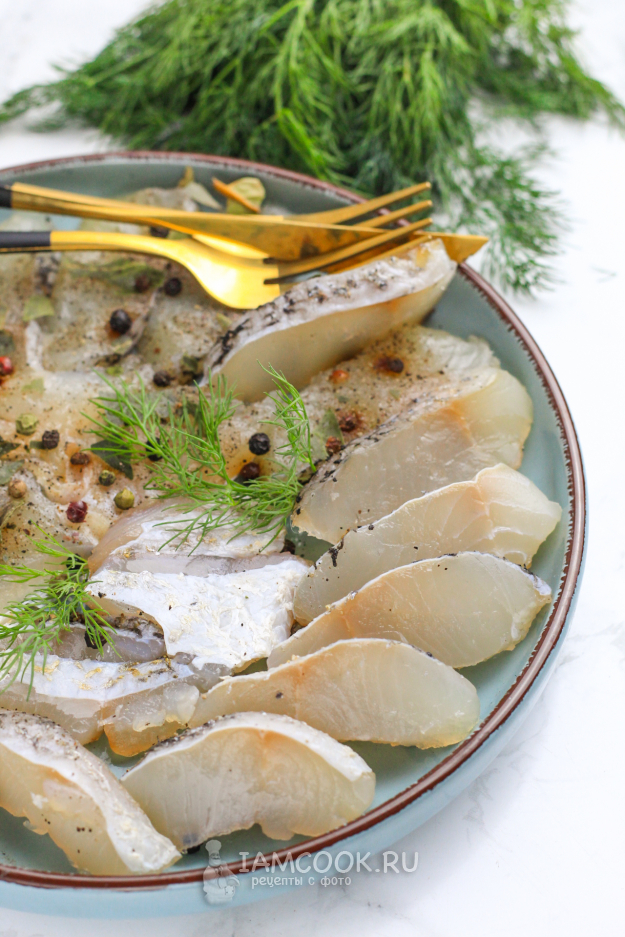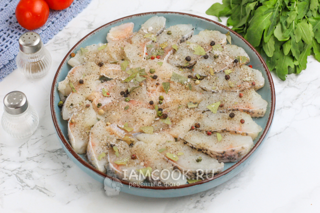 Спустя указанное время соль «вытянет» из нарезки жидкость, рыба просолится и приобретет аромат пряностей. Нижняя часть каждого ломтика станет гладкой, как стеклышко.