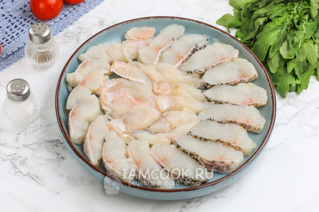 Если хотите засолить только мякоть, то срежьте и кожу. Нарежьте филе тонкими ломтиками. Толщину нарезки определяйте по своему вкусу. Выложите ровным слоем на тарелку или блюдо.