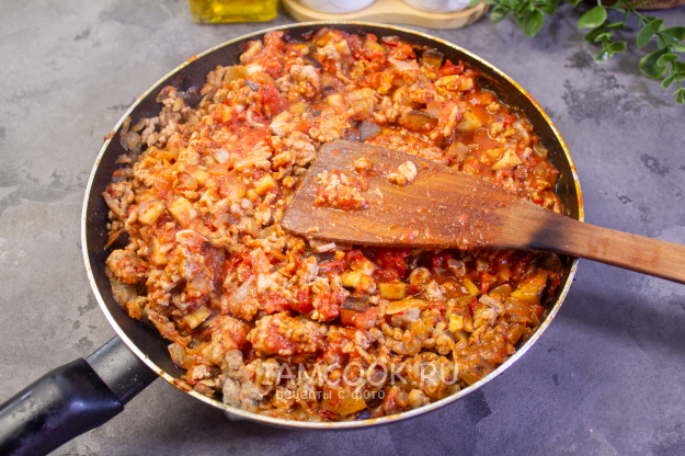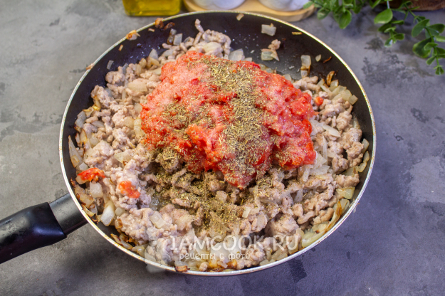 Добавьте к луку с фаршем подготовленный томатный соус и специи на ваш вкус. У меня - соль, черный молотый перец и прованские травы.