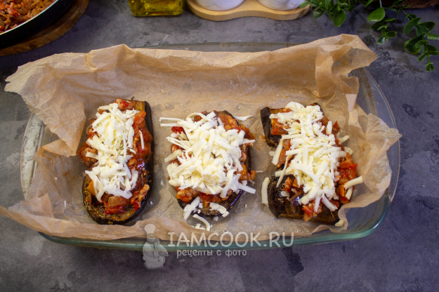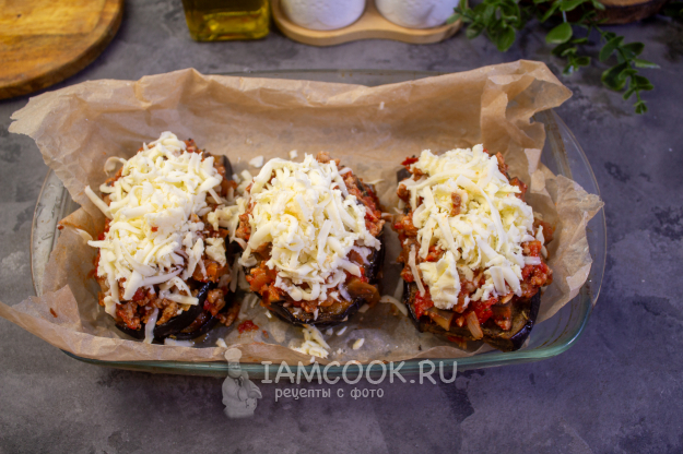Затем сверху на каждую заготовку положите еще по пластине баклажана, фарш и сыр. Запекайте баклажаны слоями с фаршем в духовке при 190 градусах 10 минут.