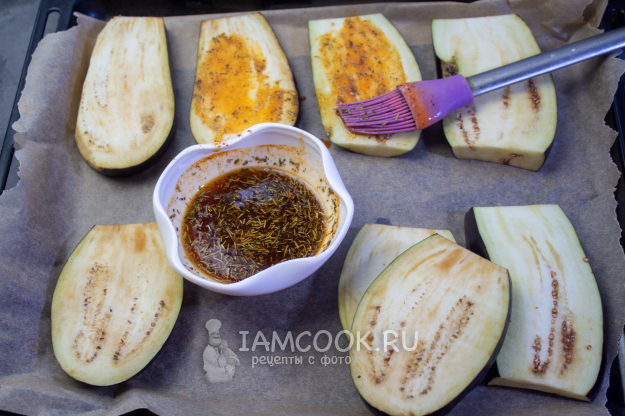 Приготовьте ароматное масло: смешайте оливковое масло со специями. Этим маслом смажьте нарезанный баклажан с двух сторон. Отправьте в разогретую до 200 градусов духовку на 10-15 минут.