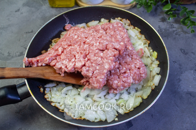 Добавьте фарш и обжаривайте вместе, пока фарш слегка не подрумянится.