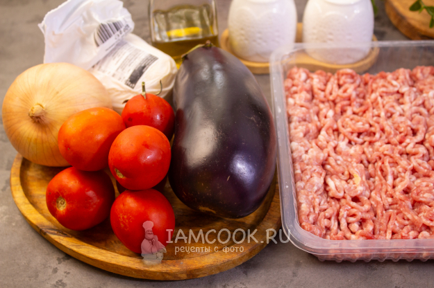 Соберите необходимые продукты для приготовления баклажанов слоями с фаршем в духовке. Баклажаны советую взять дутые, как бочонки, не очень крупные. Фарш у меня свино-говяжий, но можете заменить на тот, который вам больше нравится. Вместо помидоров возьмите, по желанию, томатную пасту или соус.