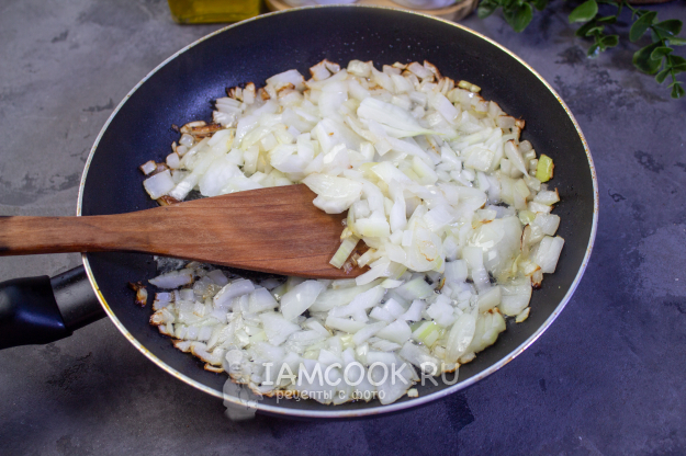 Приготовьте начинку: в сковороде на растительном масле обжарьте до мягкости мелко нарезанный лук.