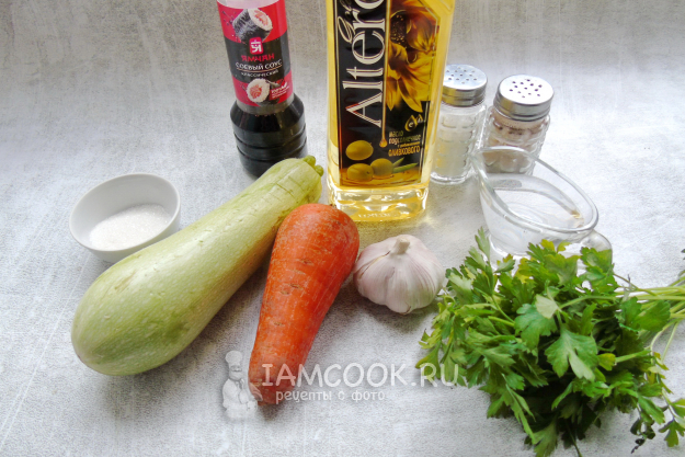 Соберите ингредиенты для приготовления закуски из кабачков и морковки.