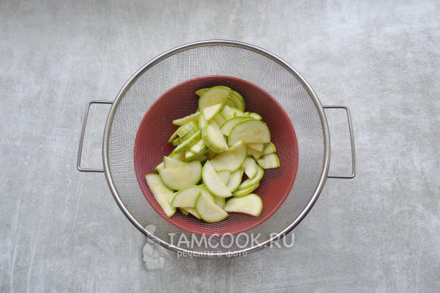 Через 30 минут ломтики кабачка станут мягкими. Откиньте их на дуршлаг и промойте водой, чтобы удалить лишнюю соль.