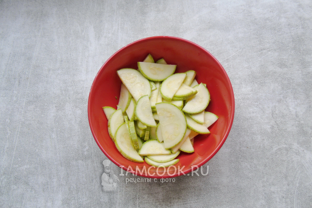 Кабачки нарежьте тонкими ломтиками, выложите в миску, посолите (2 щепотки) и перемешайте. Дайте постоять на столе 30 минут.