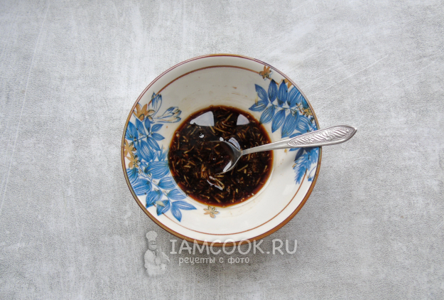 Тем временем приготовьте соус для закуски. В мисочке перемешайте соевый соус, растительное масло, уксус, соль, сахар, перец черный молотый и измельченный чеснок. Уксус также можно взять винный или яблочный.