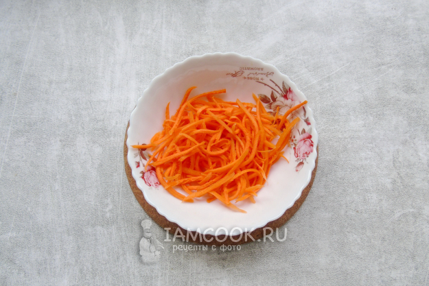 Морковь очистите, помойте и натрите на терке для моркови по-корейски. Добавьте 1 щепотку соли и перемешайте. Тоже оставьте на столе.