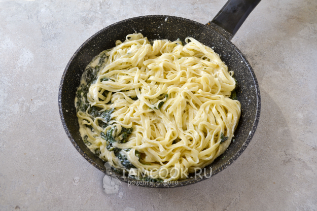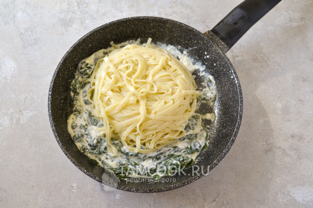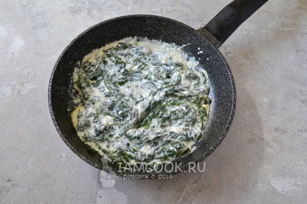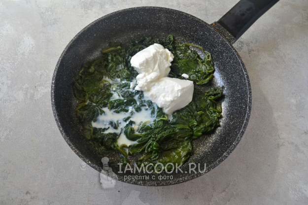 Шпинат хорошо уменьшится в объеме. Положите в сковороду рикотту, влейте сливки.