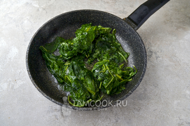 Положите шпинат на разогретую с маслом сковороду. Замороженный шпинат не обязательно размораживать. Перемешивая, обжарьте шпинат несколько минут.