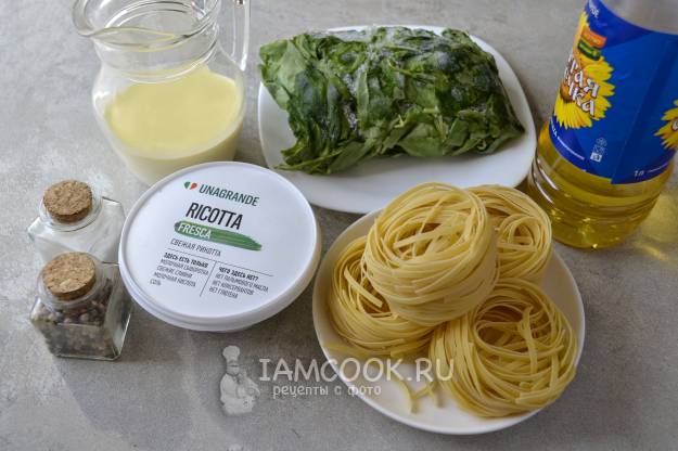 Соберите продукты для приготовления пасты с рикоттой и шпинатом.