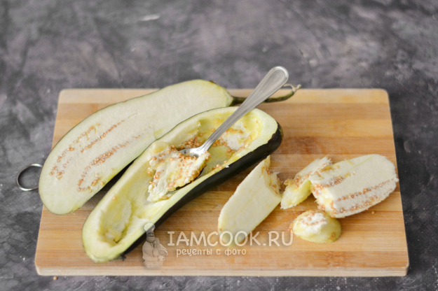 Разрежьте баклажан вдоль и при помощи чайной ложки удалите часть мякоти, оставляя стенки около 5 мм.