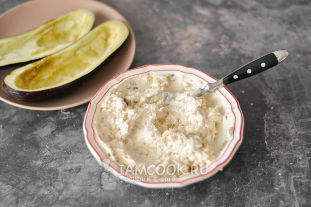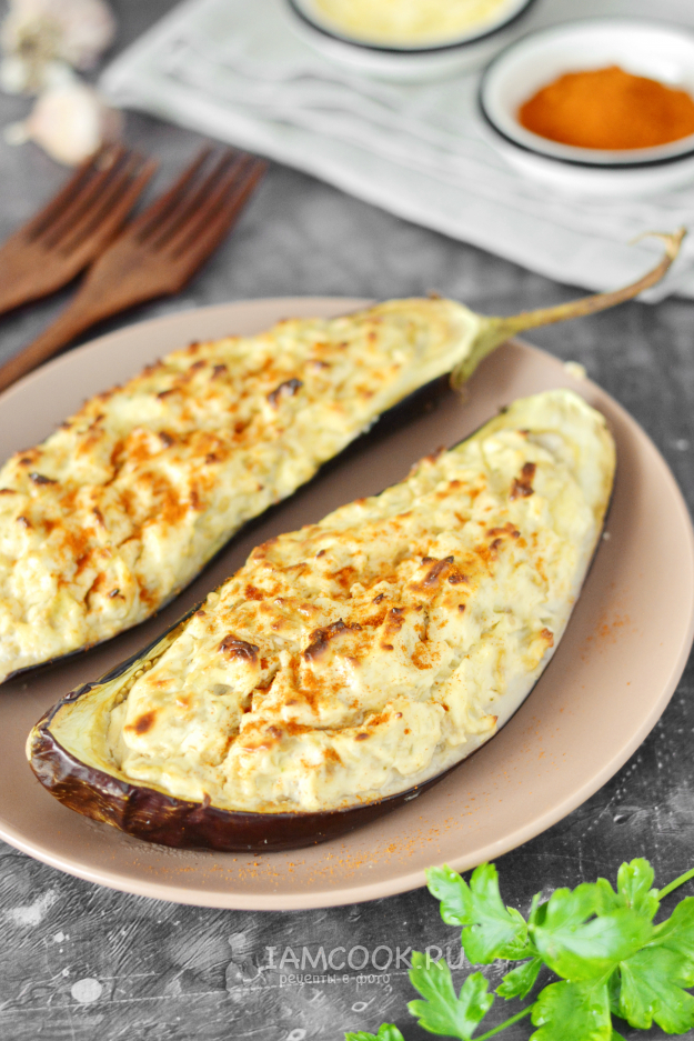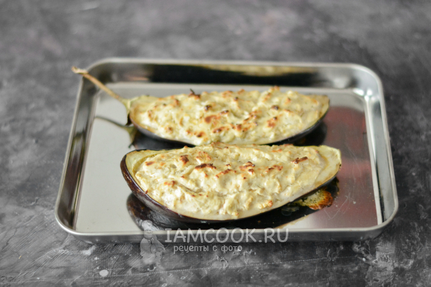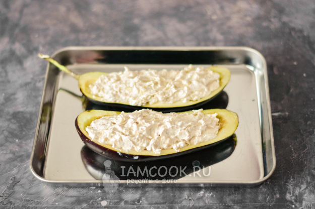 Наполните лодочки из баклажанов начинкой и положите их на противень.
