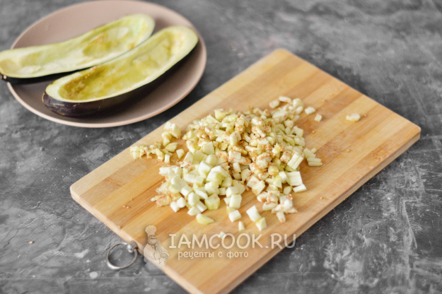 Получившиеся баклажанные лодочки слегка посолите и пока отставьте в сторонку. А вынутую мякоть баклажана нарубите мелко ножом.