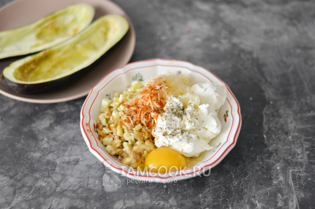 К нарубленной мякоти баклажана добавьте рикотту, натёртый пармезан, вбейте яйцо. Приправьте всё солью, сладкой паприкой и сухими итальянскими травами.