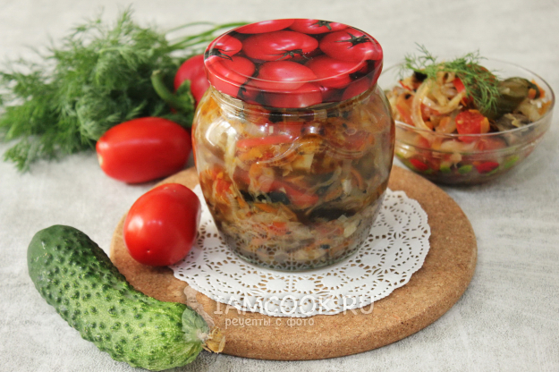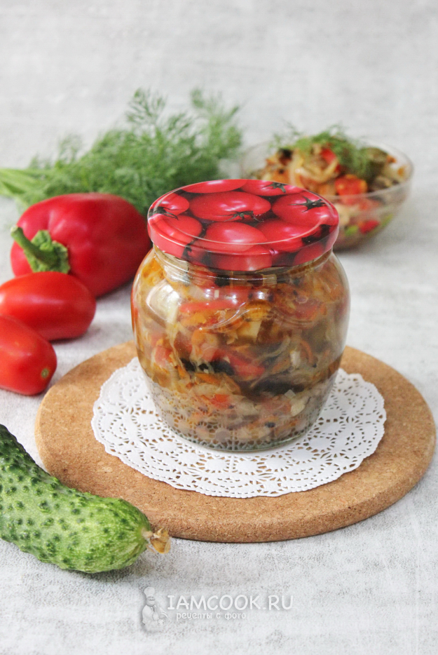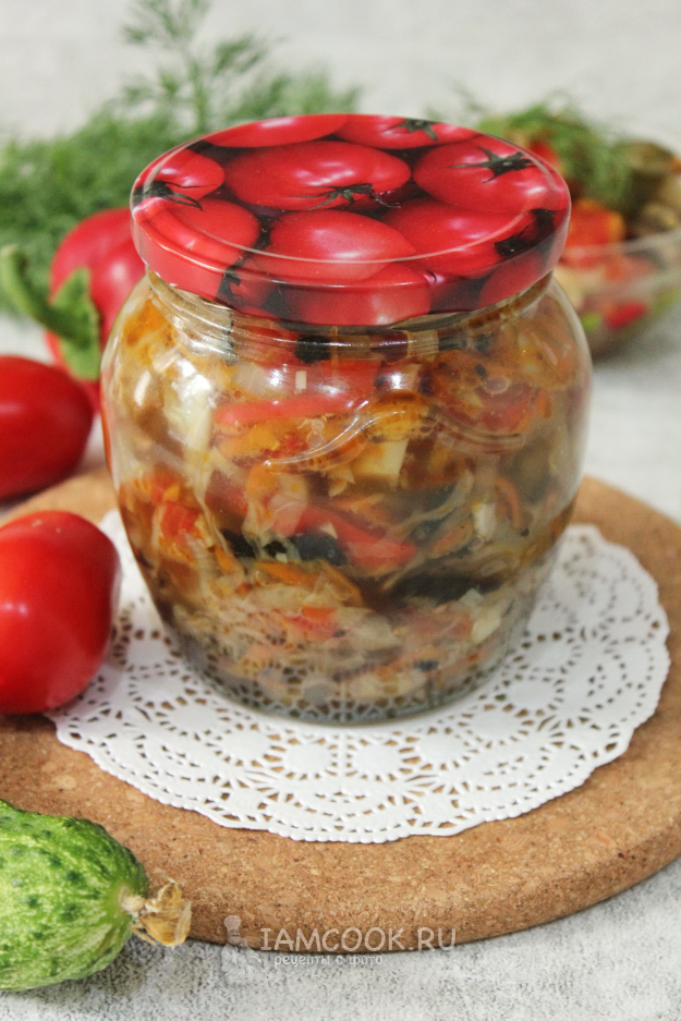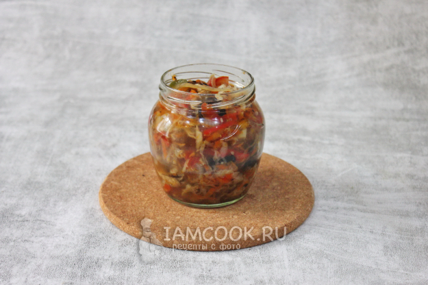 Горячий салат разложите в стерилизованные банки и закрутите стерилизованными крышками. Переверните вверх дном и закутайте в одеяло. Держите в нем до полного остывания. Храните в прохладном помещении.