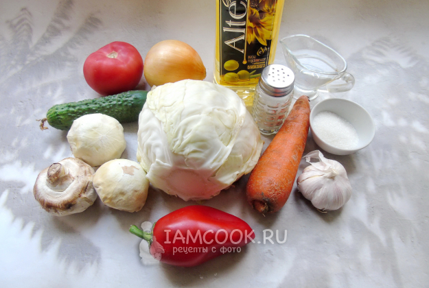 Соберите ингредиенты для приготовления салата Охотничий на зиму с грибами.