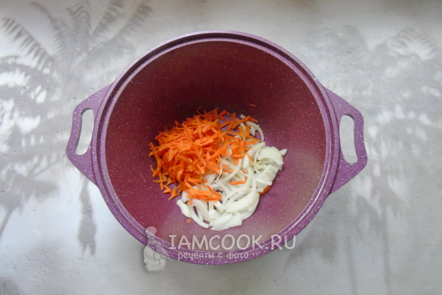 Морковь и лук очистите и помойте. Морковь натрите на терке с крупными ячейками, а лук нарежьте полукольцами. Выложите в кастрюлю с толстым дном.