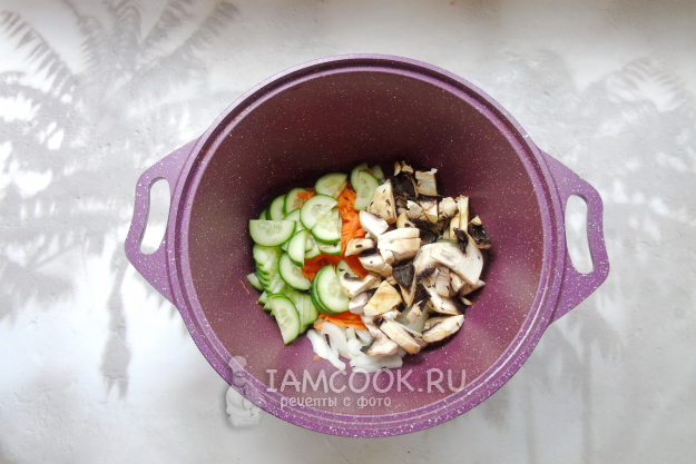 Огурцы помойте и нарежьте половинками кружков. Если у них шкурка жесткая, то нужно очистить. Шампиньоны очистите, помойте и нарежьте произвольно.