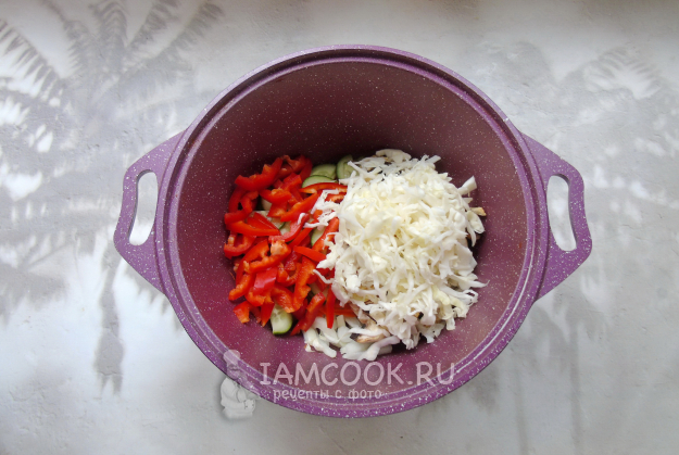 Болгарский перец очистите от семян и белых перегородок, помойте и нарежьте соломкой. Также соломкой нарежьте капусту.