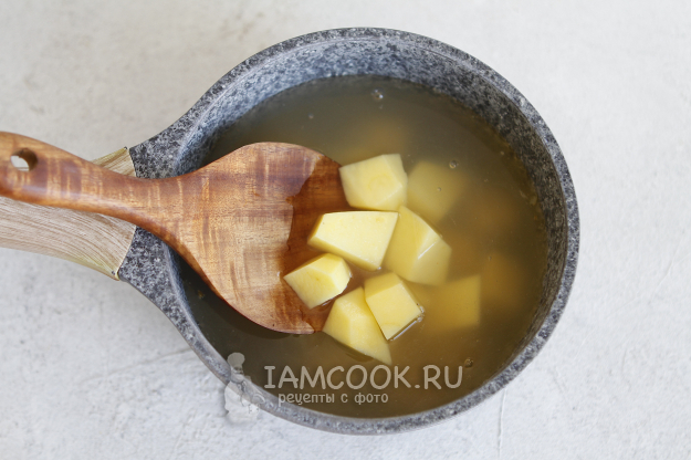 Бульон довести до кипения и добавить в него картофель. Варить картофель на среднем огне до полной готовности.