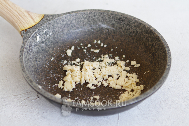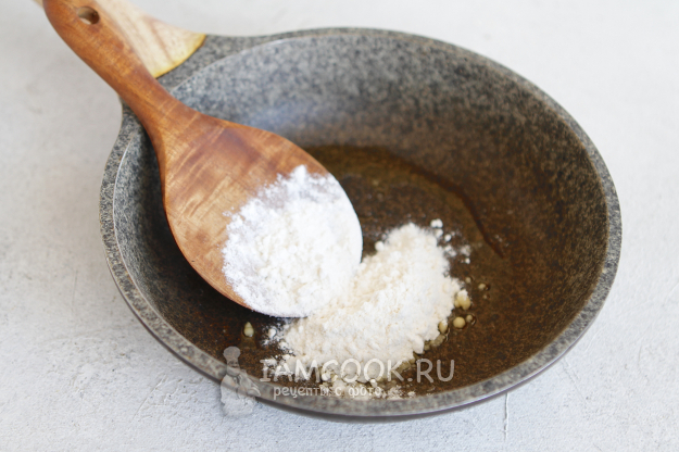 Разогреть сковороду с кусочком масла. Всыпать муку и на небольшом огне, регулярно помешивая, слегка ее обжарить.
