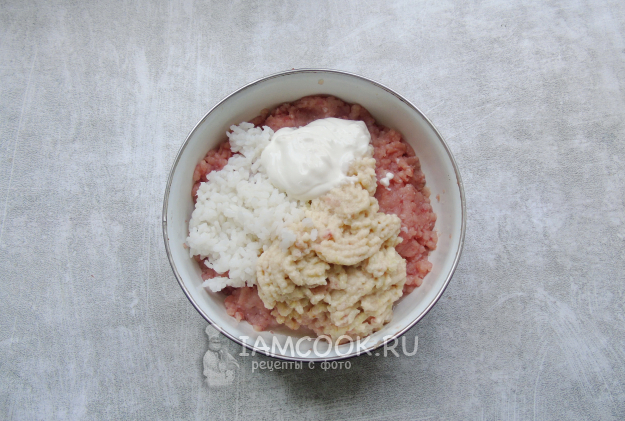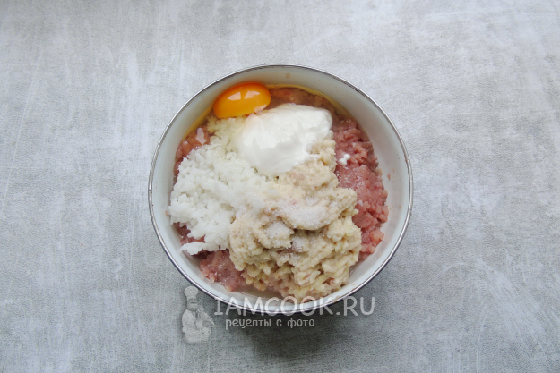 Рис сварите. Для этого его помойте, залейте водой и варите до готовности. После немного охладите и добавьте в фарш. Выложите сметану.