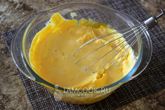 Яйца размешайте без взбивания и вмешайте на слабых оборотах в начинку. Если масса будет выглядеть жидкой, то добавьте кукурузный крахмал.