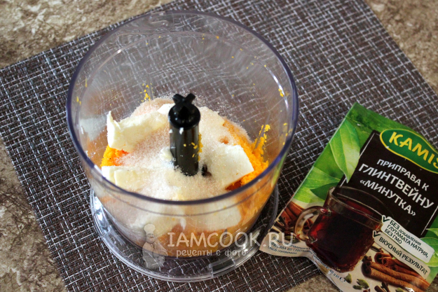 Соедините и перемешайте тёртую тыкву с размягченным маслом, сахаром и смесью для глинтвейна.