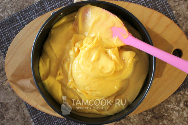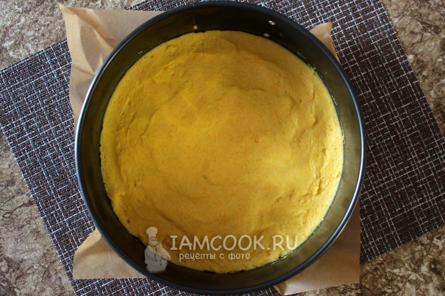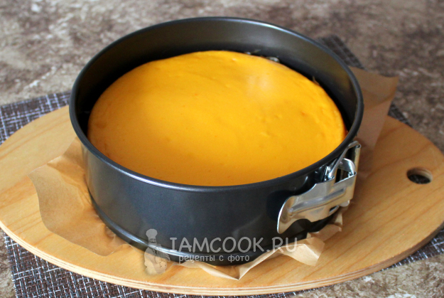 Быстро замесите тыквенно-песочное тесто, равномерно распределите его по дну разъёмной формы, проложенной пекарской бумагой.