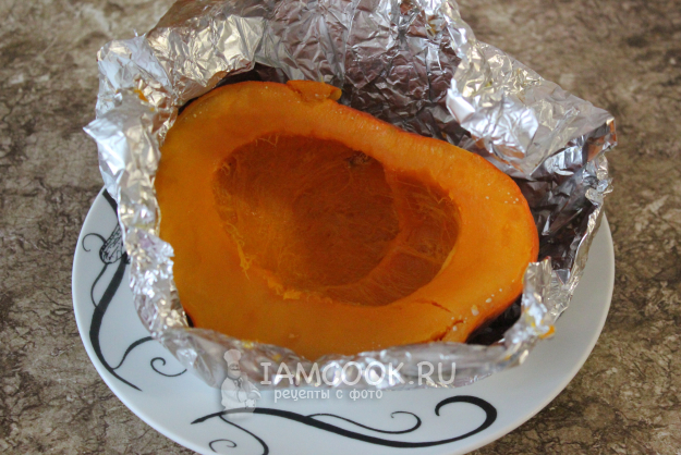 Заранее подготовьте тыкву. Предлагаю завернуть кусок тыквы в фольгу и запечь в духовке, например, заодно с чем-то, т.е. параллельно. Температура - 170-200 градусов, а время зависит от сорта тыквы, размера куска и свойств духовки, и может быть от 25 до 50 минут. Проверяйте прокалыванием мякоти.