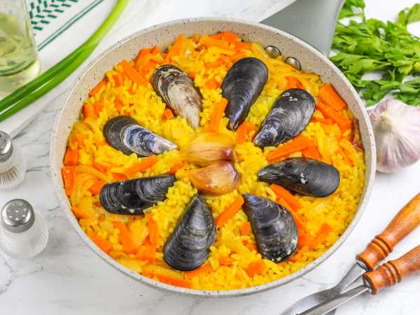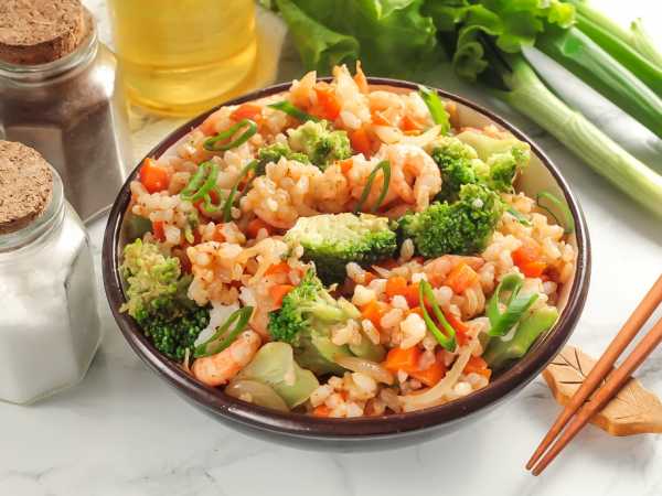 Выложите креветки в сковороду с рисом, карри, морковью и луком. Добавьте измельченный чеснок.