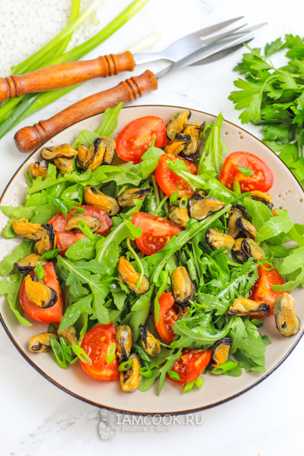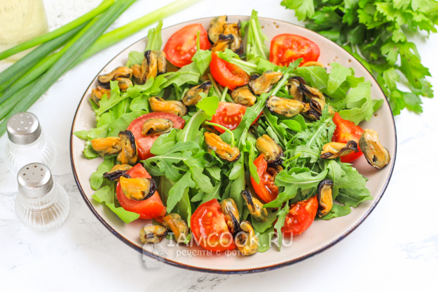 Посолите салат, сбрызните растительным маслом без аромата, лимонным соком (по желанию). Присыпьте измельченным зеленым луком и подайте салат с мидиями, рукколой и помидорами черри к столу.