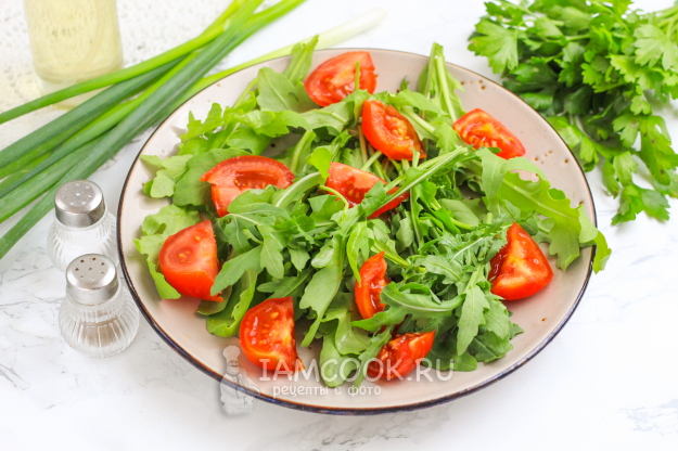 Помидоры, рукколу и зеленый лук промойте в воде, подсушите бумажными салфетками.