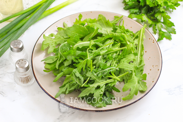 Выложите зелень на тарелку - она будет являться сочной витаминной основой для салата.