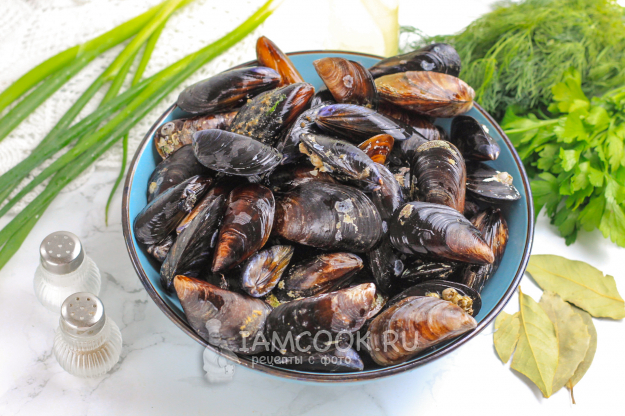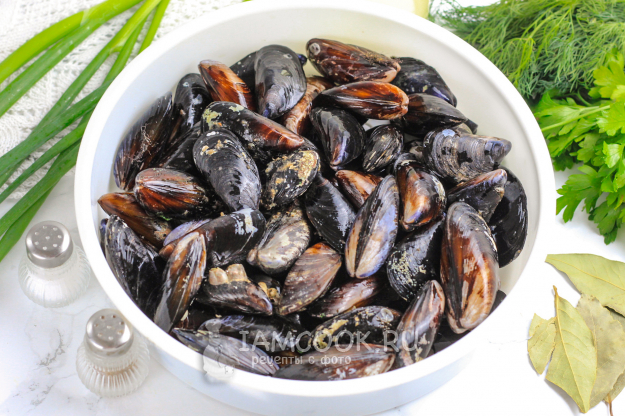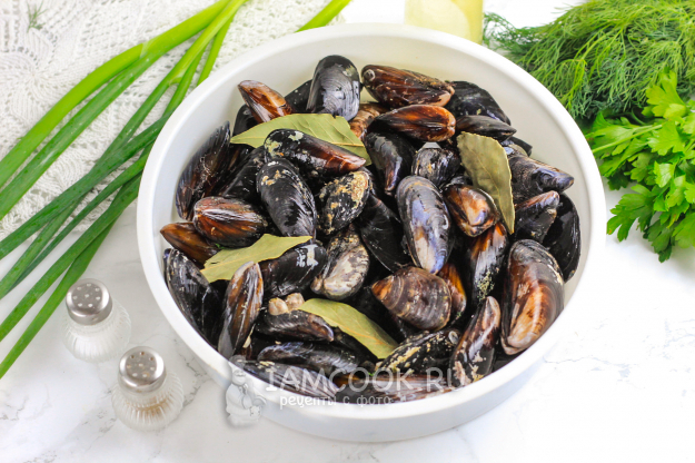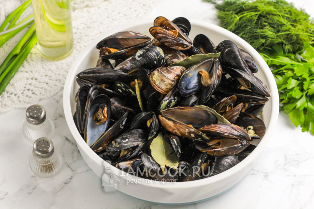 Вставьте между ними лавровые листья. Можно листья всыпать в чашу с водой или добавить другие пряности по вкусу: орегано, тимьян, розмарин и т.д. Главное - пряности не должны перебивать вкус мидий!