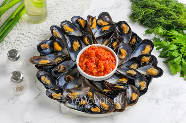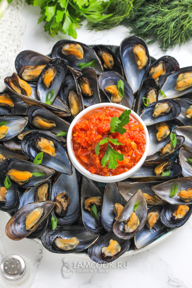 Вторую створку каждой раковины удалите и выложите горячие мидии в половинке створки на тарелку. Присыпьте солью и подайте сваренные на пару мидии с любым вкусным соусом, хлебом, багетом и т.д.