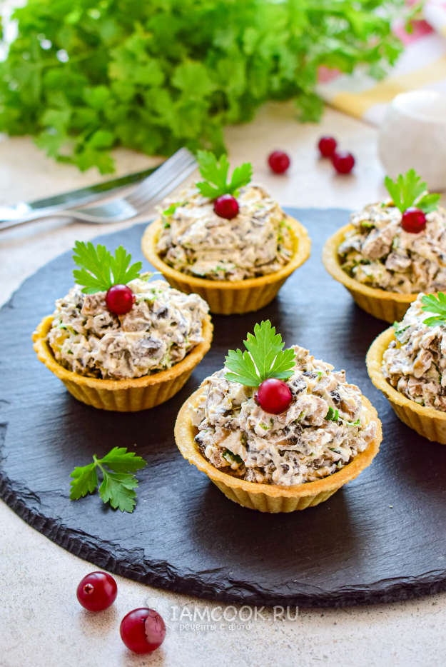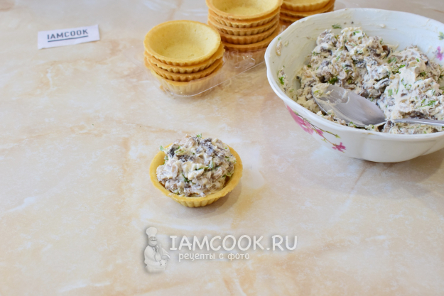 Тарталетки наполните готовой грибной начинкой. Украсьте на свой вкус и сразу подавайте тарталетки с творожным сыром и грибами к столу. Приятного аппетита!
